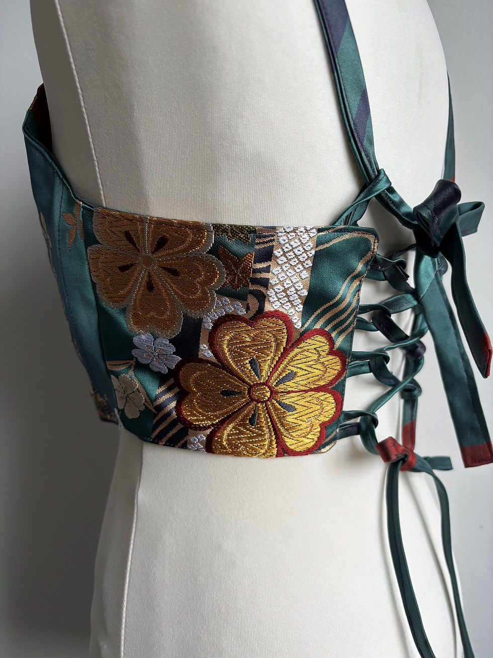 Emerald Dark Green Butterfly Vintage Silk Kimono Corset/ 蝶々のコルセット