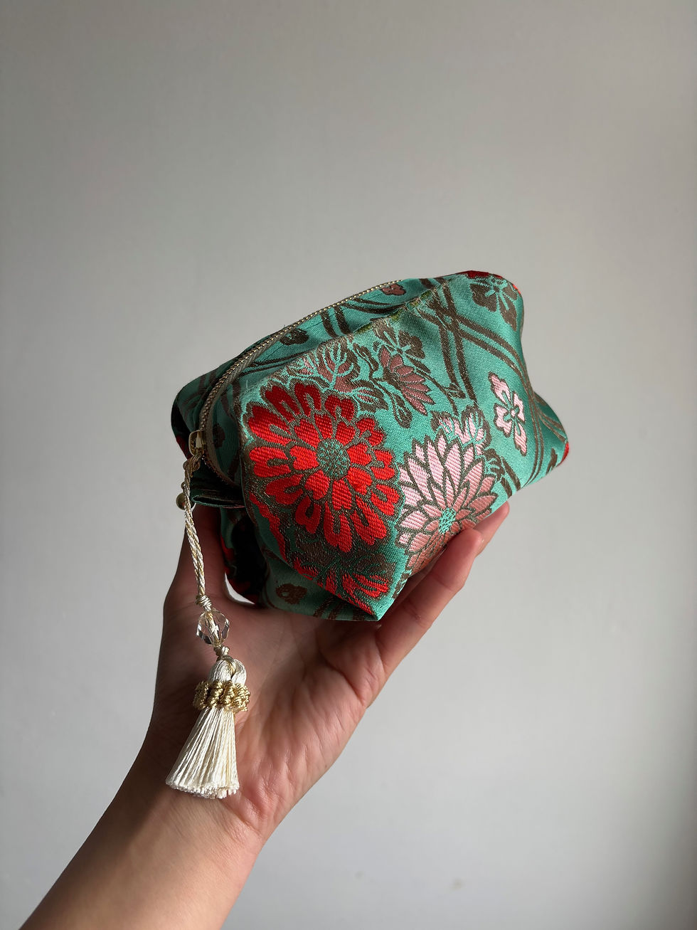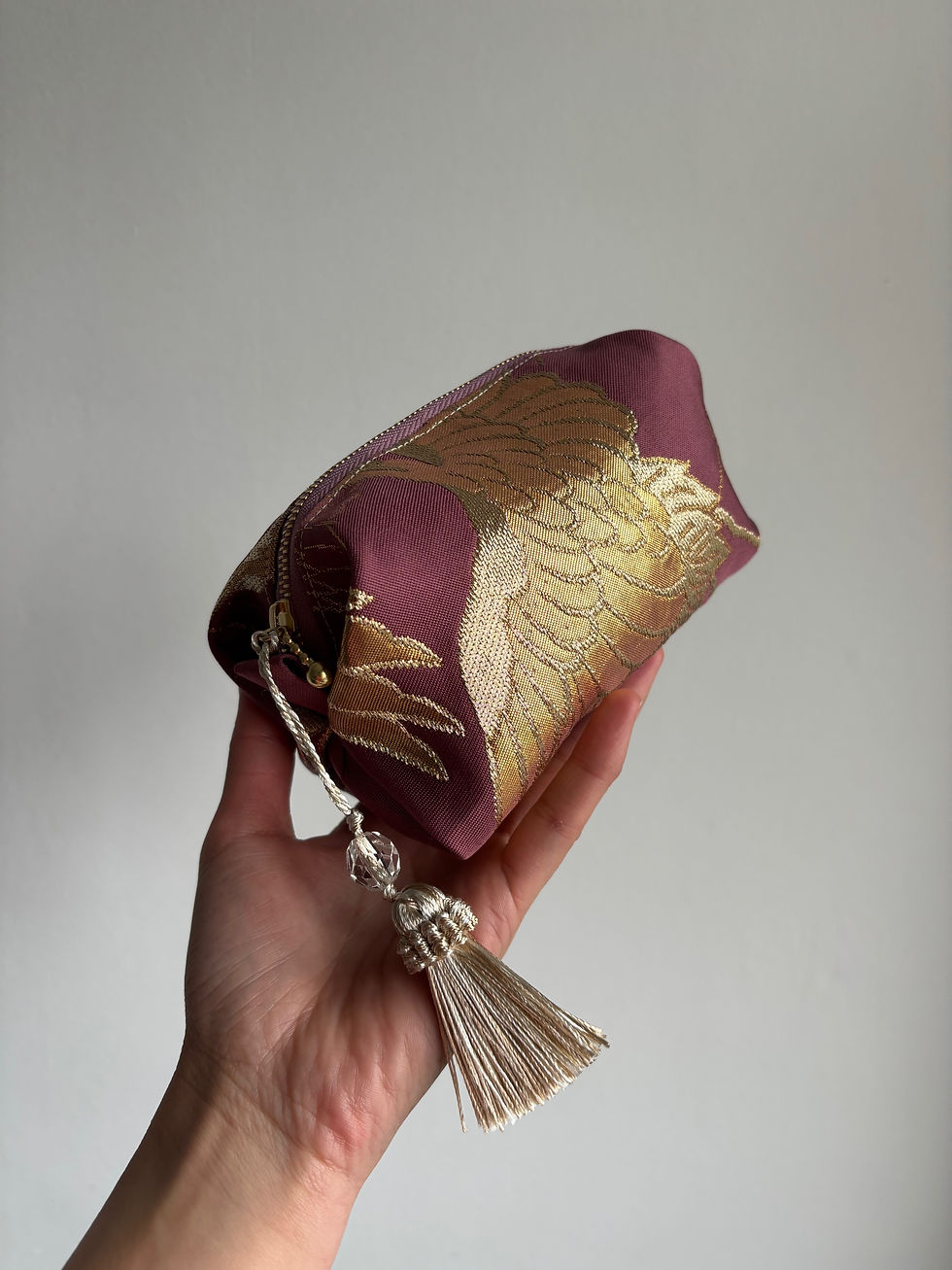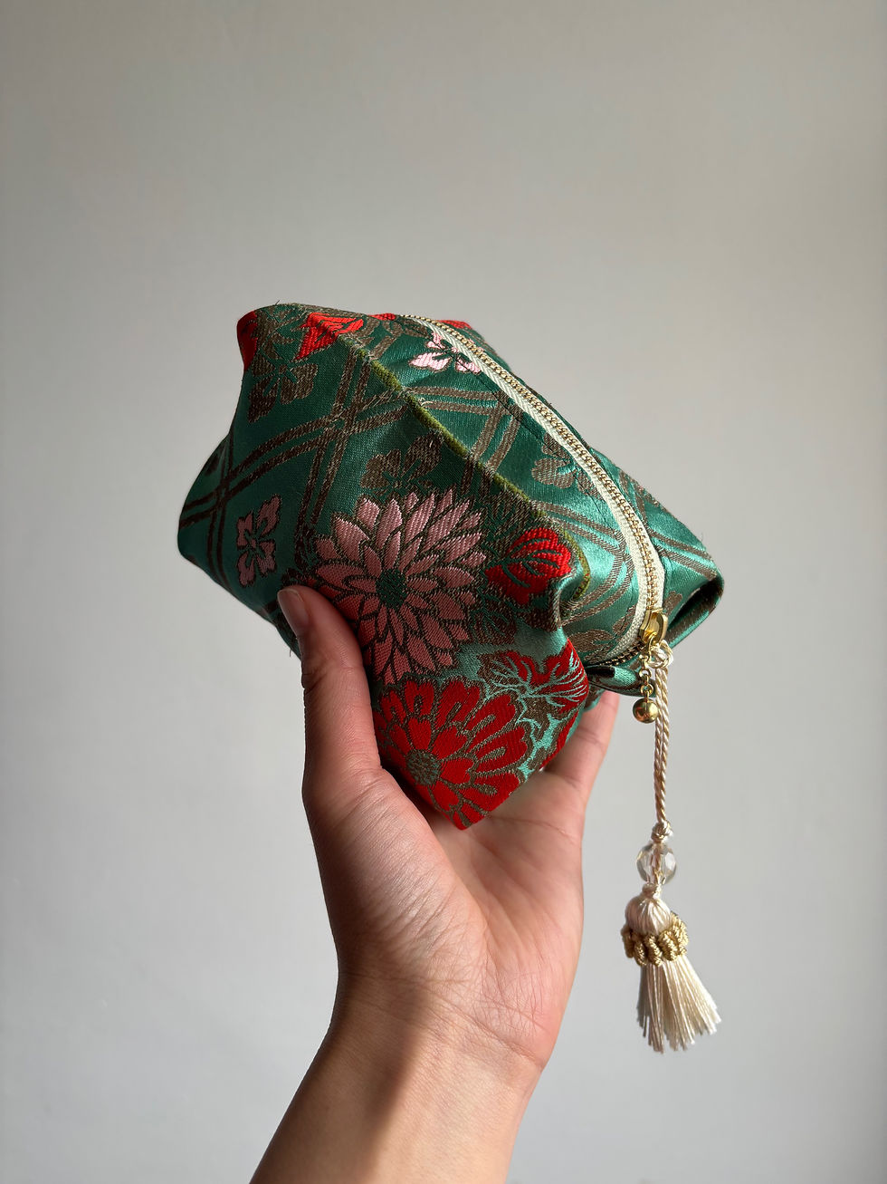 The Story Behind the PieceThe hanadori (花鳥 / flowers and birds) motif is a celebrated theme in Japanese textile art, representing the beauty of nature, harmony, and joyful seasons. Each pouch is individually cut, sewn, and finished by hand in my London studio, making every piece a unique work of art infused with history and symbolism.
