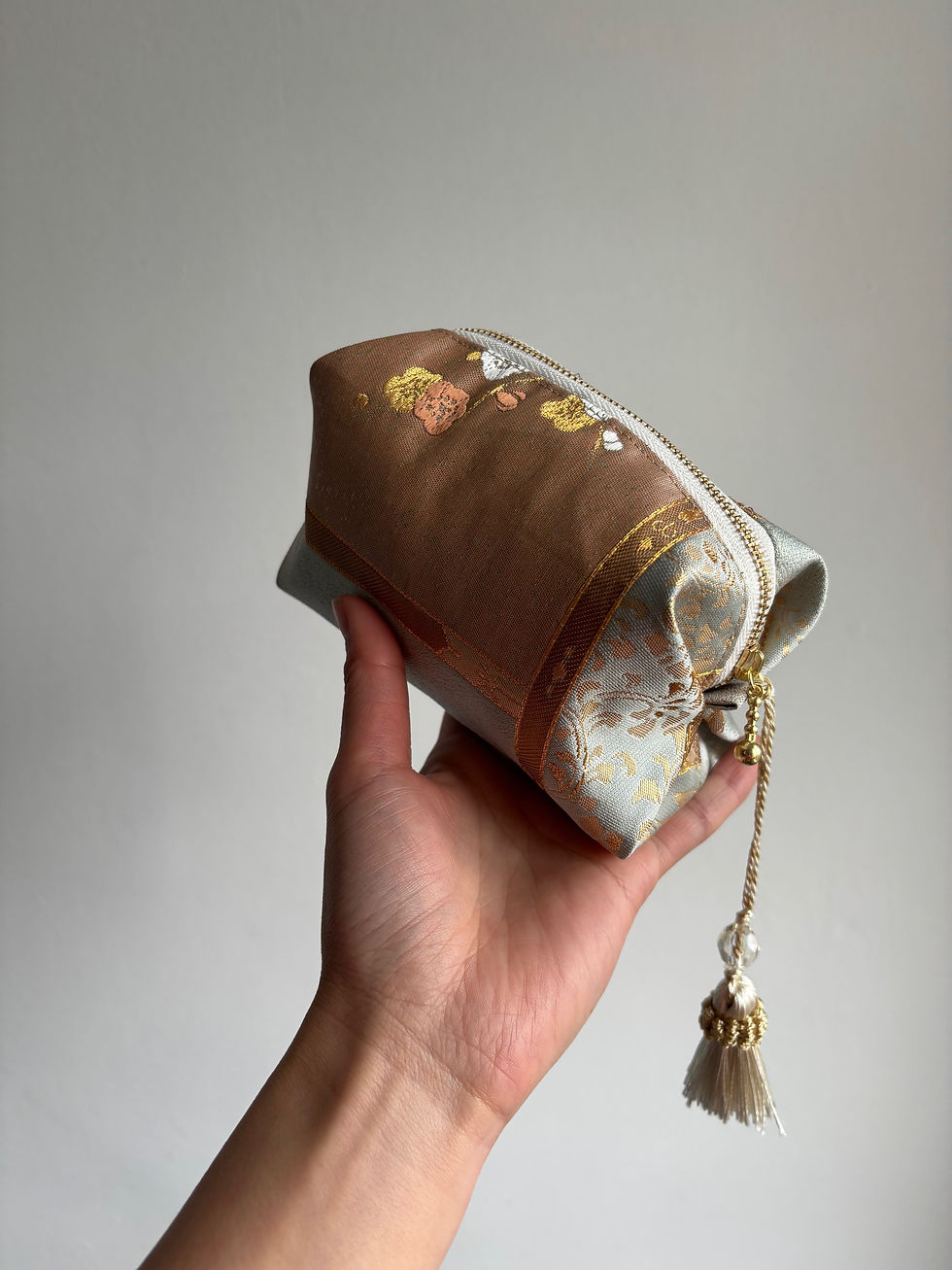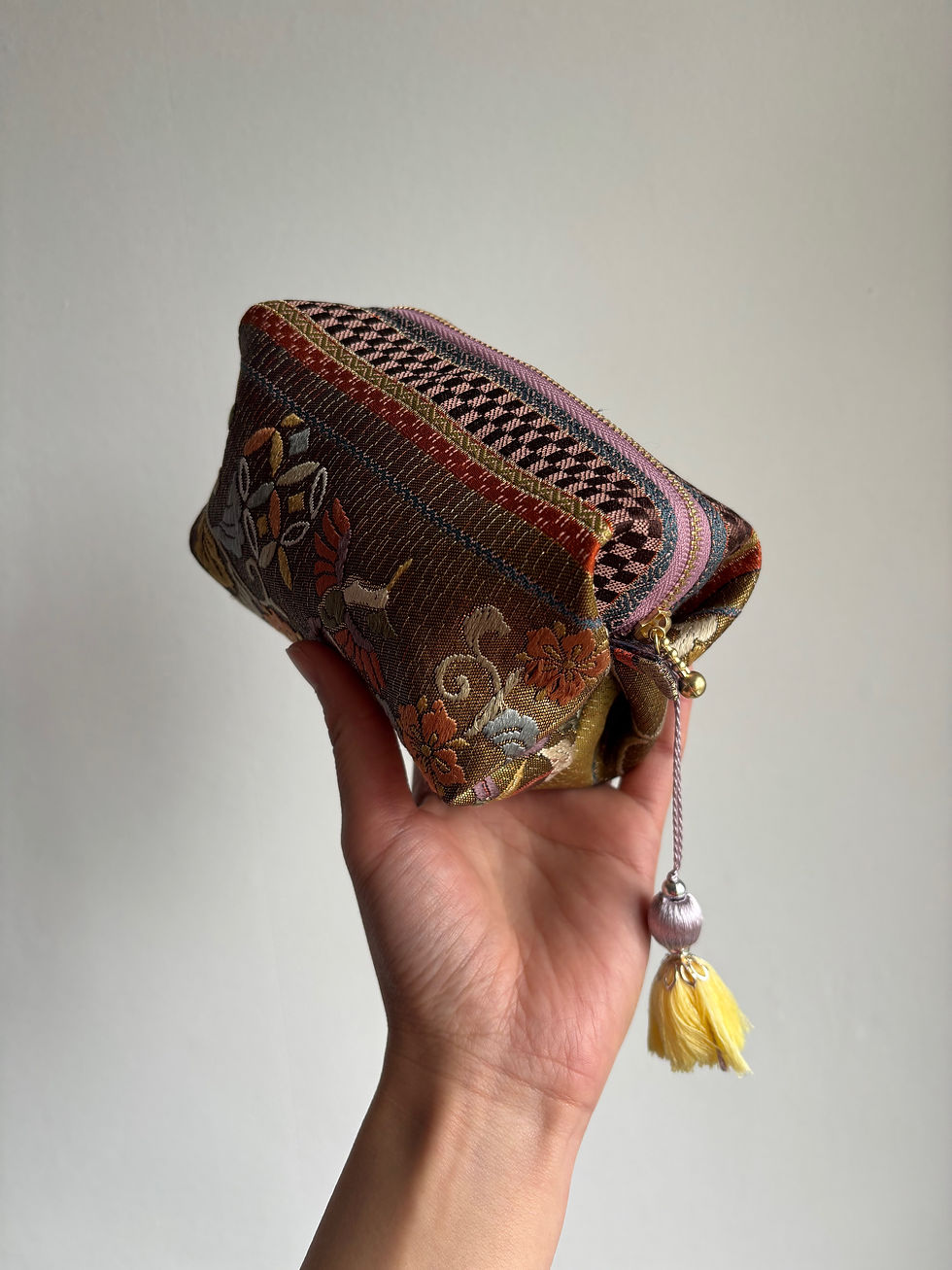 How to Style ItUse it as a chic travel companion, handbag organiser, or keepsake case. Its soft golden-purple tones and elegant hanadori motif make it a versatile accessory for everyday sophistication or special occasions.
